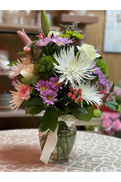 EclorefloralIn stockOur Clear Violet arrangement captures beauty in its purest form. Featuring fresh pink roses, fluffy white hydrangea, lilies, and delicate alst...